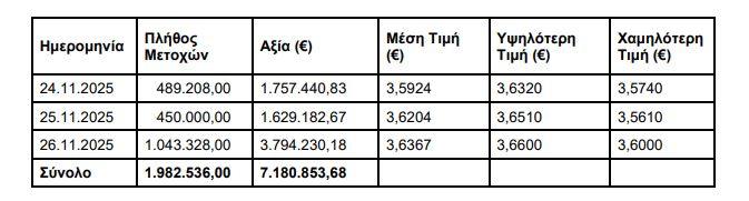 H ΑΛΦΑ ΤΡΑΠΕΖΑ (η ‘Τράπεζα’), σε συνέχεια της από 17.09.2025 ανακοίνωσής της, ενημερώνει ότι, στο Πλαίσιο του Προγράμματος Αγοράς Ιδίων Μετοχών που εγκρίθηκε με την απόφαση της Έκτακτης Γενικής Συνέλευσης των Μετόχων της με ημερομηνία 12.6.2025, κατά το διάστημα 24.11.2025 – 26.11.2025, προέβη σε αγορά μέσω του Χρηματιστηρίου Αθηνών συνολικά 1.982.536 ίδιων μετοχών, με μέση τιμή κτήσης 3,6221 € ανά μετοχή και συνολικό κόστος 7.180.853,68 €.