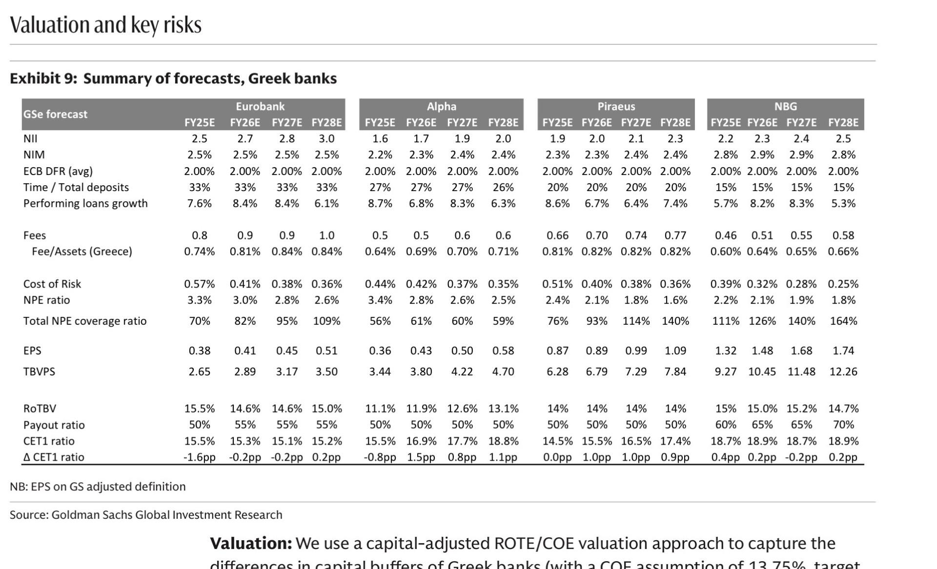 Κατά την αμερικανική τράπεζα, τα καθαρά επιτοκιακά έσοδα έχουν κορυφώσει, ενώ αναμένει μια σταδιακή ανάκαμψη από το τέταρτο τρίμηνο του 2025, κυρίως λόγω της συνεχούς ανάπτυξης των εταιρικών χορηγήσεων και της ενίσχυσης της λιανικής. Ενδεικτικά, το κόστος κινδύνου και τα μη εξυπηρετούμενα ανοίγματα (NPEs) βρίσκονται σε πορεία σύγκλισης με τον ευρωπαϊκό μέσο όρο, κάτι που δημιουργεί ένα σταθερό περιβάλλον κερδοφορίας. Για την τριετία 2025-2027, η Goldman προβλέπει απόδοση ιδίων κεφαλαίων (ROTE) γύρω στο 14%, πλησίον του ευρωπαϊκού μέσου όρου.