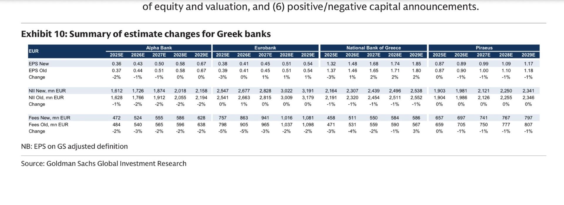 Η Goldman Sachs αναθεώρησε ελαφρώς προς τα κάτω τις εκτιμήσεις της για τα κέρδη ανά μετοχή (EPS) το 2025, με τη βασική αιτία να είναι οι χαμηλότερες επιδόσεις στο trading και η πιο συγκρατημένη άνοδος του καθαρού επιτοκιακού περιθωρίου. Οι νέες εκτιμήσεις δείχνουν μια υποβάθμιση περίπου 3% για τις τρεις τράπεζες, αλλά παρά την αναθεώρηση αυτή, ο οίκος βλέπει θετικές προοπτικές για το μεσοπρόθεσμο μέλλον.