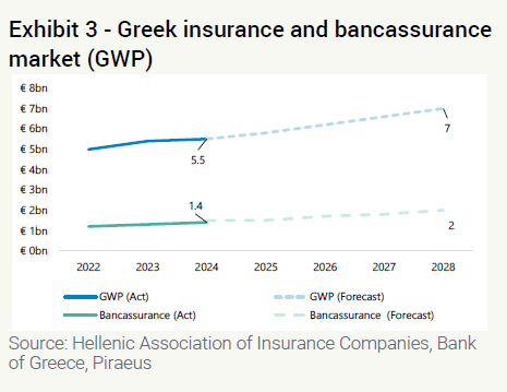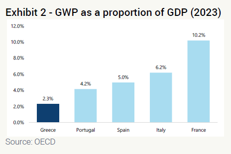 Σε σύγκριση με άλλες ευρωπαϊκές χώρες, η Ελλάδα παραμένει σε χαμηλά επίπεδα στον ασφαλιστικό τομέα. Το 2023, τα Gross Written Premiums (GWP) ως ποσοστό του ΑΕΠ ήταν 2,3% στην Ελλάδα, ενώ για τους νοτιοευρωπαϊκούς ανταγωνιστές ήταν περίπου 5%.