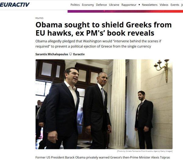 «Με συνεχάρη για το δημοψήφισμα», αφηγείται ο Τσίπρας για τον Ομπάμα, «και είπε ότι είχε ενισχύσει τη θέση μου – αλλά είχε επίσης πυροδοτήσει κινήσεις για την έξοδο της Ελλάδας από την Ευρωζώνη». Ο Ομπάμα φέρεται να προειδοποίησε ότι η προσπάθεια καθοδηγούνταν «για πολιτικούς λόγους» και προέτρεψε τον Τσίπρα να «παραμείνει ψύχραιμος».