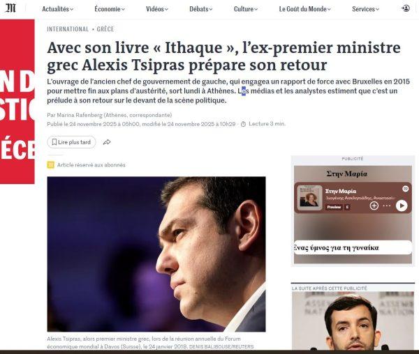 Η γαλλική εφημερίδα Le Monde αφιερώνει ένα εκτεταμένο δημοσίευμα στην κυκλοφορία του βιβλίου του Αλέξη Τσίπρα. Μιλάει για «τον αριστερό πρώην πρωθυπουργό, ο οποίος το 2015 ήρθε σε αντιπαράθεση με τις Βρυξέλλες για να τερματίσει τα μέτρα λιτότητας». Η εφημερίδα εκτιμά ότι η «Ιθάκη» είναι το πρώτο βήμα για την επάνοδό του ως ηγέτη της κεντροαριστεράς στην Ελλάδα.