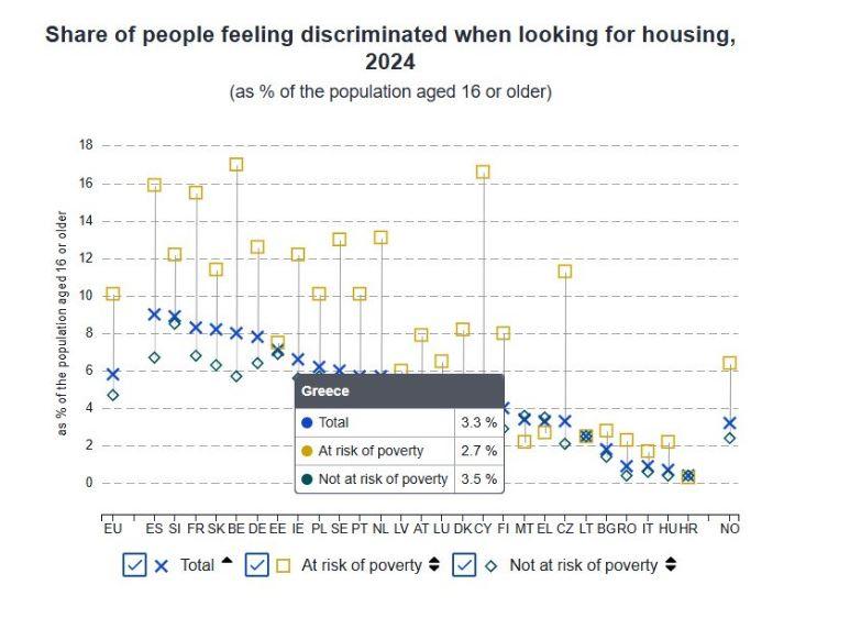 Προβληματισμό προκαλούν και τα στοιχεία για το ποσοστό των Ευρωπαίων που δηλώνουν ότι υφίστανται διακρίσεις όταν αναζητούν κατοικία. Το 2024, σχεδόν 6% όσων αναζητούσαν σπίτι τα τελευταία πέντε χρόνια ανέφεραν ότι ένιωσαν τουλάχιστον μία φορά να αντιμετωπίζονται με αυτόν τον τρόπο.