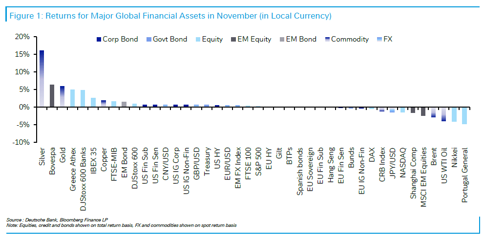Η Deutsche Bank χαρακτήρισε στην μηνιαία της έκθεση τον Νοέμβριο ως έναν μήνα «δύο όψεων» για τις αγορές, με τα ρίσκα αρχικά να αποτυπώνονται, πριν σημειωθεί ισχυρή ανάκαμψη που οδήγησε τον δείκτη S&P 500 (+0,2% σε όρους συνολικής απόδοσης).