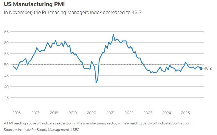 Το Ινστιτούτο Διαχείρισης Εφοδιαστικής Αλυσίδας (Institute for Supply Management) ανακοίνωσε τη Δευτέρα ότι ο δείκτης PMI για τη μεταποιητική βιομηχανία υποχώρησε στις 48,2 μονάδες τον περασμένο μήνα από 48,7 τον Οκτώβριο. Μια τιμή κάτω από 50 μονάδων υποδηλώνει συρρίκνωση της μεταποιητικής βιομηχανίας, η οποία αντιπροσωπεύει το 10,1% της αμερικανικής οικονομίας.