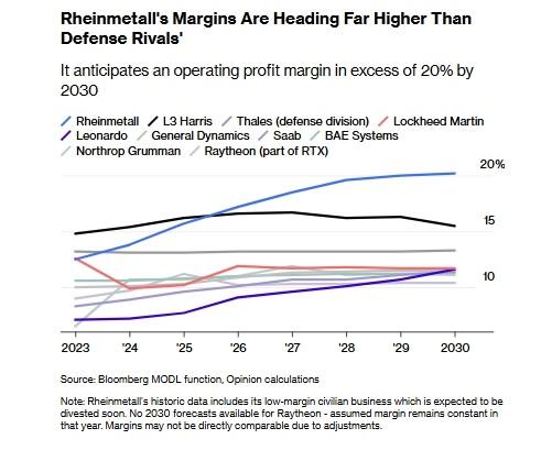 Ενώ είναι φυσικό για έναν κατασκευαστή όπλων να επωφελείται από τον επανεξοπλισμό, όπως έκαναν οι φαρμακευτικές εταιρείες κατά τη διάρκεια της πανδημίας, η αναμενόμενη κερδοφορία της Rheinmetall την ξεχωρίζει από τους άλλους δυτικούς γίγαντες της άμυνας, όπως δείχνει το παρακάτω διάγραμμα.