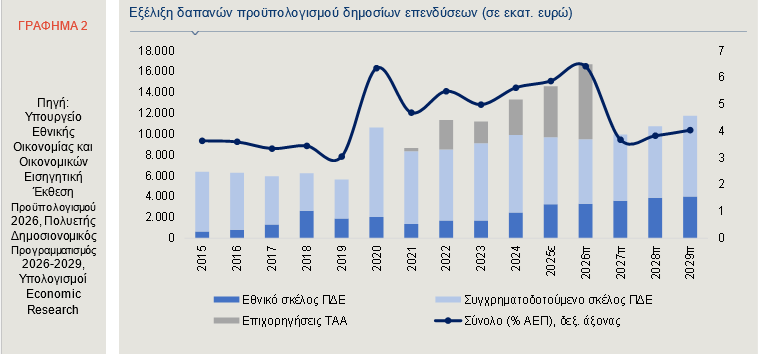 εκτιμάται περίπου σε Ευρώ 5,5 δισ. Σημειώνεται ότι από το 2027 μειώνονται οι δαπάνες δημοσίων επενδύσεων, καθώς ολοκληρώνεται το σκέλος των επιχορηγήσεων του Ταμείου Ανάκαμψης, με τα συνολικά κεφάλαια να ανέρχονται σε Ευρώ 32,5 δισ. την περίοδο 2027-2029[i], σύμφωνα με τον Πολυετή Δημοσιονομικό Προγραμματισμό 2026-2029.