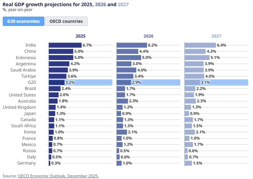 Η Γερμανία εξακολουθεί να υστερεί σε σχέση με την παγκόσμια οικονομική ανάπτυξη. Ο οργανισμός των βιομηχανικών χωρών αναμένει παγκόσμια ανάπτυξη 3,2% για το τρέχον έτος, ακολουθούμενη από επιβράδυνση στο 2,9% το 2026 και στη συνέχεια μια μικρή ανάκαμψη στο 3,1% το 2027.