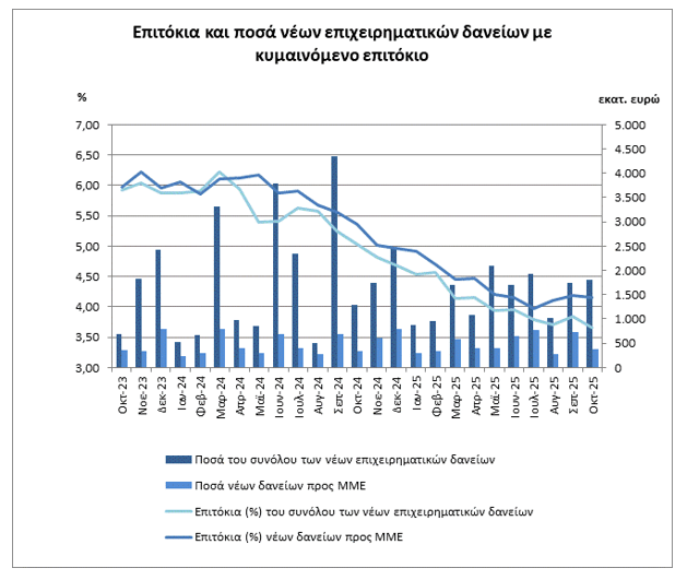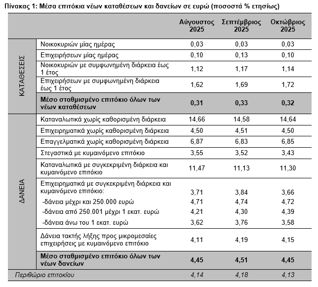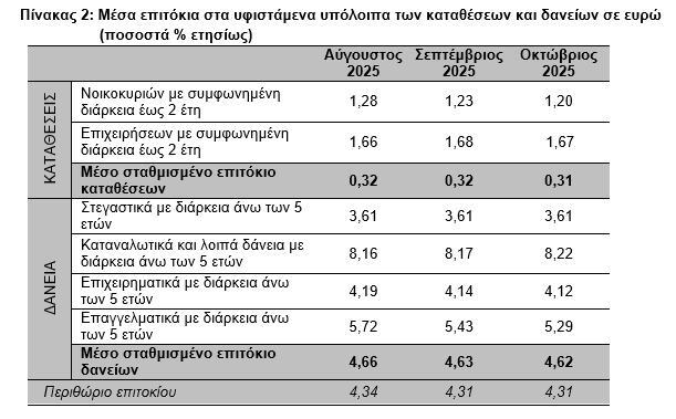 Βάσει των ίδιων στοιχείων, τον Οκτώβριο του 2025, τα μέσα σταθμισμένα επιτόκια του συνόλου των υφιστάμενων καταθέσεων και δανείων παρέμειναν σχεδόν αμετάβλητα στο 0,31% και 4,62% αντίστοιχα. Έτσι, το περιθώριο επιτοκίου μεταξύ των υφιστάμενων καταθέσεων και δανείων παρέμεινε αμετάβλητο στις 4,31 εκατοστιαίες μονάδες.