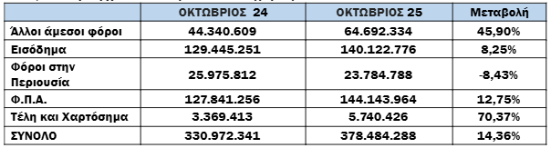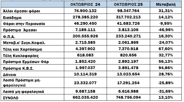 Για το 10μηνο, οι συνολικές εισπράξεις έναντι νέου ληξιπρόθεσμου (εκτός 10 ΜΦΚ) έφτασαν τα 2.639 εκ. €, ενώ την αντίστοιχη περίοδο του 2024 έφτασαν τα 2.415 εκ. € (αύξηση κατά 9,28%).