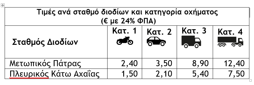 Αντιστοίχως, για τον πλευρικό Κάτω Αχαϊας οι τιμές διαμορφώνονται σε 1,50 ευρώ για την πρώτη κατηγορία, σε 2,10 ευρώ για τη δεύτερη, σε 5,40 ευρώ για την τρίτη και σε 7,50 ευρώ για την τέταρτη κατηγορία.