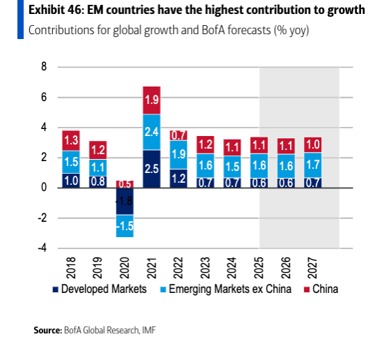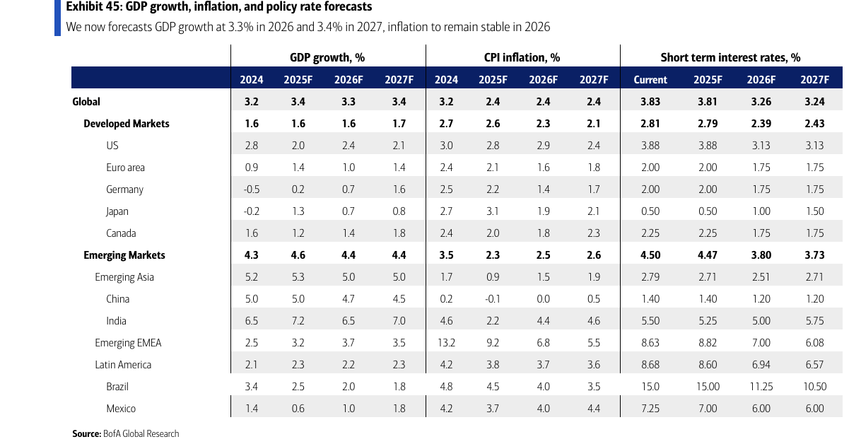 Η βάση του σεναρίου της αμερικανικής τράπεζας, περιλαμβάνει ασθενέστερο δολάριο, χαμηλότερα επιτόκια, χαμηλές τιμές πετρελαίου και ανοδικά χρηματιστήρια — συνθήκες που ιστορικά στηρίζουν τις αναδυόμενες αγορές, οι οποίες αντιπροσωπεύουν το 60% του παγκόσμιου ΑΕΠ και το ήμισυ της παγκόσμιας ανάπτυξης που αναμένεται για τα επόμενα δύο χρόνια.