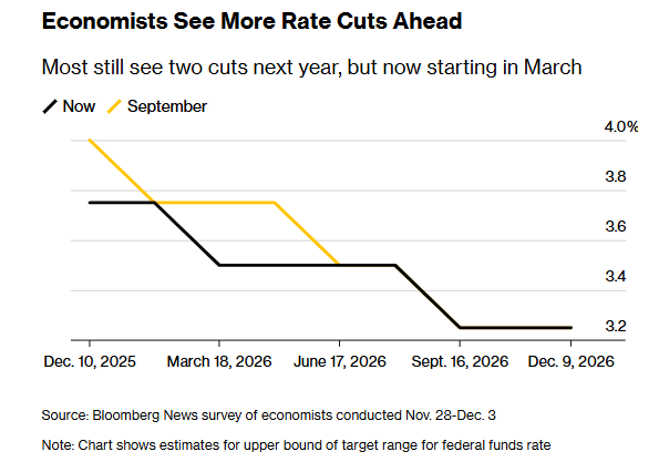 Ο μέσος όρος των ερωτηθέντων εκτιμά ότι η κεντρική τράπεζα των ΗΠΑ θα ακολουθήσει αυτή την κίνηση με δύο ακόμη μειώσεις κατά 0,25% το 2026, ξεκινώντας από τον Μάρτιο. Η μείωση της επόμενης εβδομάδας θα επεκτείνει τη σειρά μειώσεων που αποφασίστηκαν στις δύο τελευταίες συνεδριάσεις για τη νομισματική πολιτική, τον Σεπτέμβριο και τον Οκτώβριο.
