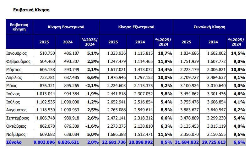 Τόσο η εγχώρια, όσο και η διεθνής επιβατική κίνηση παρουσίασαν άνοδο, υπερβαίνοντας τα επίπεδα του 2024 κατά 5,0% και 11,5% αντίστοιχα.
