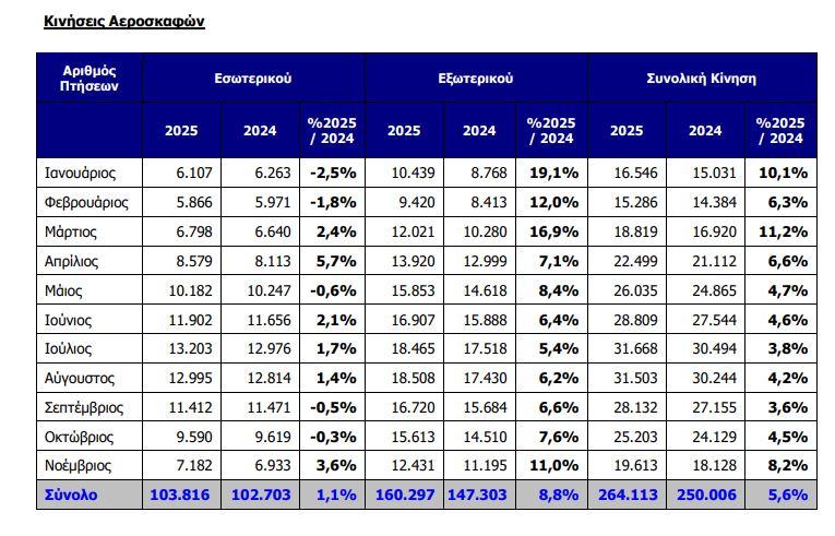 Ο αριθμός των πτήσεων στον Διεθνή Αερολιμένα Αθηνών κατά τη διάρκεια των έντεκα πρώτων μηνών του 2025 ανήλθε σε 264.113, καταγράφοντας αύξηση της τάξης του 5,6% σε σχέση με το 2024.