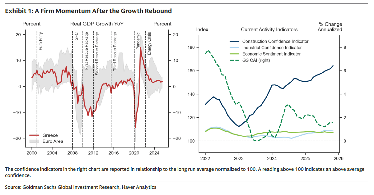 Ο δείκτης Current Activity Indicator (CAI) της Goldman Sachs υποδεικνύει ότι η ελληνική οικονομία διατηρεί ανθεκτικότητα συμβατή με ρυθμούς ανάπτυξης άνω του 2%, ενώ η επιχειρηματική εμπιστοσύνη παραμένει ισχυρή, ιδιαίτερα στον κλάδο των κατασκευών.