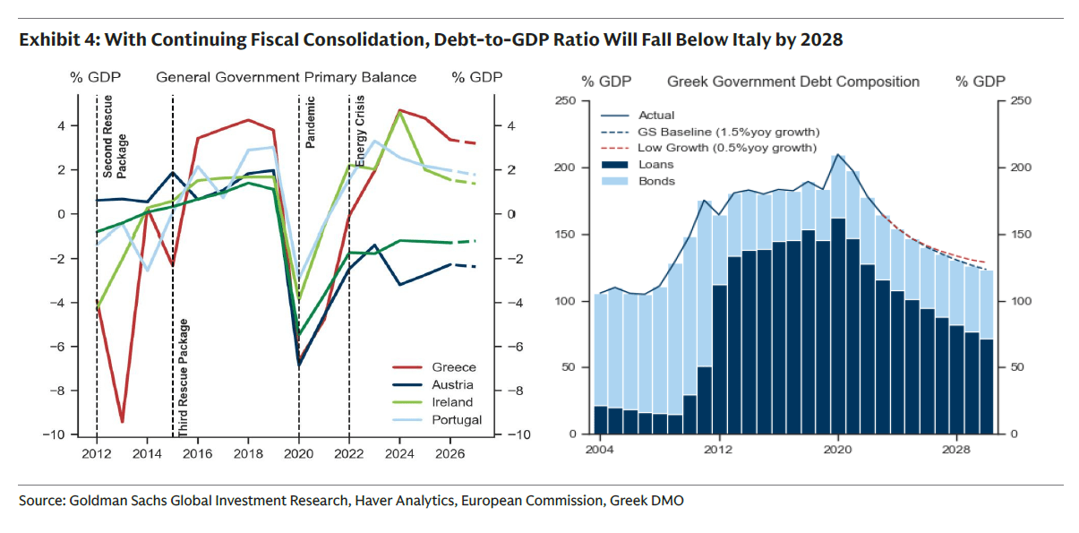 Η Goldman Sachs υπενθυμίζει, επίσης, ότι η Ελλάδα στοχεύει σε πρωτογενές πλεόνασμα 3% του ΑΕΠ το 2026, το υψηλότερο στην Ευρωζώνη. Περίπου 70% του ελληνικού χρέους βρίσκεται σε μακροπρόθεσμα προγράμματα ευρωπαϊκής στήριξης, με αποτέλεσμα ένα από τα χαμηλότερα αποτελεσματικά επιτόκια δανεισμού στην Ευρωζώνη.