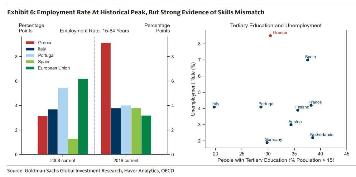 Παρά τα ιστορικά υψηλά επίπεδα απασχόλησης, πολλοί εξειδικευμένοι εργαζόμενοι παραμένουν υποαπασχολούμενοι. Η Goldman Sachs τονίζει ότι η Ελλάδα χρειάζεται στοχευμένα προγράμματα reskilling και upskilling ώστε να αξιοποιηθεί πλήρως το εργατικό δυναμικό και να στηριχθεί η μελλοντική παραγωγικότητα.