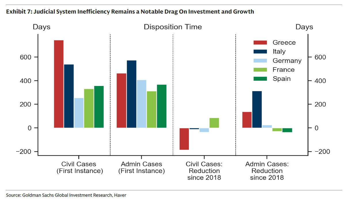 Ο δείκτης Disposition Time (DT) παραμένει από τους υψηλότερους στην Ευρωζώνη για αστικές και εμπορικές δίκες, αποθαρρύνοντας επενδύσεις και μειώνοντας την επιχειρηματική βεβαιότητα. Παρά ορισμένες βελτιώσεις σε διοικητικές υποθέσεις, οι καθυστερήσεις σε πολιτικές και εμπορικές υποθέσεις έχουν αυξηθεί από το 2018.