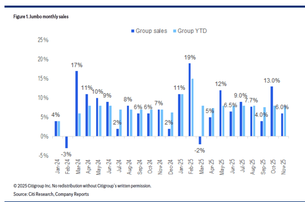 Αυτές οι κινήσεις αναμένεται να ενισχύσουν την ανάπτυξη των εσόδων της Jumbo στον τομέα της χονδρικής, εκτιμά η Citi.