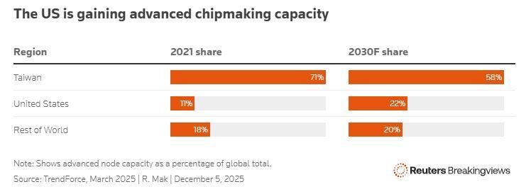 Στους πιο προηγμένους επεξεργαστές αιχμής που τροφοδοτούν τα κέντρα δεδομένων τεχνητής νοημοσύνης, το μερίδιο των ΗΠΑ είναι σχεδόν μηδενικό, καθιστώντας την μεγαλύτερη οικονομία του κόσμου εξαιρετικά εξαρτημένη από την Ταϊβάν. Και με το Πεκίνο, το οποίο θεωρεί το δημοκρατικά κυβερνούμενο νησί ως δικό του έδαφος, να αυξάνει την στρατιωτική και διπλωματική πίεση, οι αξιωματούχοι εθνικής ασφάλειας στην Ουάσιγκτον είναι πρόθυμοι να μειώσουν αυτή την εξάρτηση.