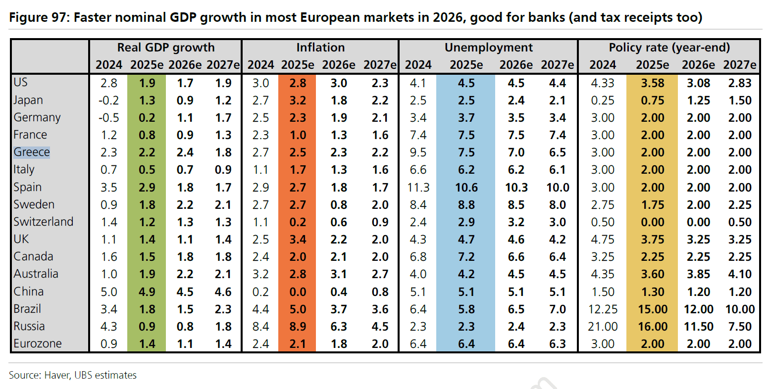 Η εκτίμηση της UBS είναι για επιτάχυνση της ονομαστικής ανάπτυξης του ΑΕΠ στις περισσότερες ευρωπαϊκές αγορές, με την Ελλάδα και την Ισπανία να ξεχωρίζουν. Η ονομαστική ανάπτυξη είναι αυτή που οδηγεί τις τράπεζες (και τα φορολογικά έσοδα, τα οποία είναι καθοριστικά όταν σκεφτόμαστε τα δημόσια οικονομικά, τις πολιτικές ενέργειες και τις απόψεις για τα επιτόκια, εξηγεί).