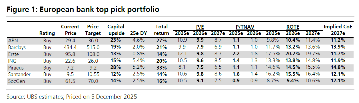 Με 15% αναμενόμενο ROE, ο τομέας προσθέτει περισσότερες από 200 μονάδες βάσης CET1 το χρόνο σε ένα υπερβάλλον κεφάλαιο άνω των 90 μονάδων βάσης στο τρίτο τρίμηνο του 2025. Με τις επαναγορές μετοχών να είναι χρηματοοικονομικά χρήσιμες (αν και λιγότερο σε τρέχουσες αποτιμήσεις), αλλά στρατηγικά ουδέτερες, η UBS αναμένει περαιτέρω δραστηριότητα που θα προσθέσει στα EPS, αξία που δεν φαίνεται να καταγράφεται στις αποτιμήσεις.