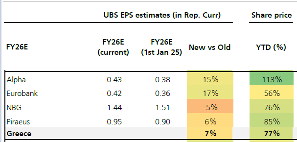 Παρόλα αυτά, η UBS, για τις ελληνικές τράπεζες, πλην της Εθνικής, έχει προχωρήσει σε βελτίωση των εκτιμήσεων της για τα κέρδη ανά μετοχή του 2026.