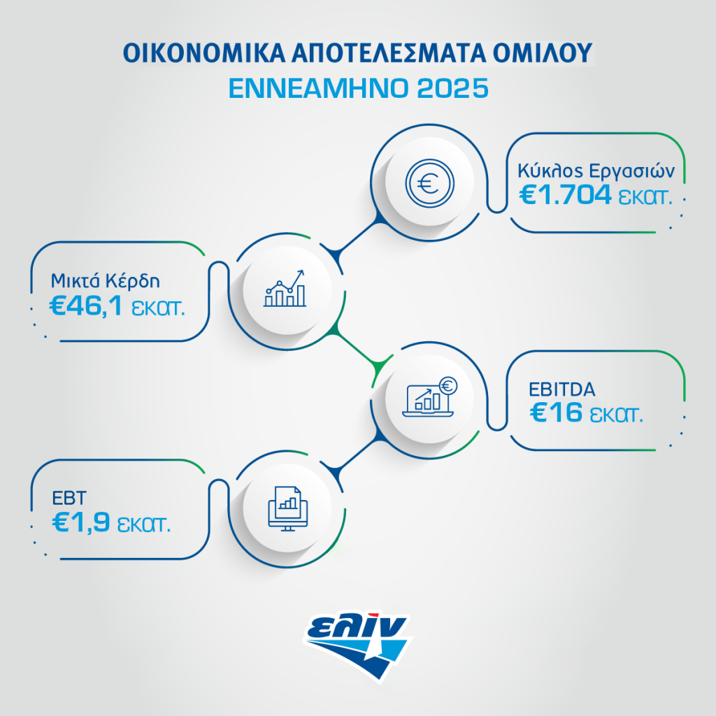 Ο ενοποιημένος κύκλος εργασιών του Ομίλου ελίν κατά το εννεάμηνο του 2025 ανήλθε σε €1.704,71 εκατ. έναντι €2.050,64 εκατ. του εννεαμήνου του 2024, καταγράφοντας μείωση 17%. Για την ίδια χρονική περίοδο, τα μικτά κέρδη του Ομίλου ανήλθαν σε €46,13 εκατ. έναντι €61,97 εκατ. του εννεαμήνου του 2024 και τα κέρδη προ φόρων, χρηματοοικονομικών αποτελεσμάτων και αποσβέσεων (EBITDA) σε €16 εκατ. έναντι €30,61 εκατ. το αντίστοιχο διάστημα του 2024, παρουσιάζοντας μείωση 48%. Τα ενοποιημένα προ φόρων αποτελέσματα του Ομίλου (EBT) κατά το εννεάμηνο του 2025 ανήλθαν σε κέρδη €1,91 εκατ. έναντι €9,53 εκατ. του εννεαμήνου του 2024.