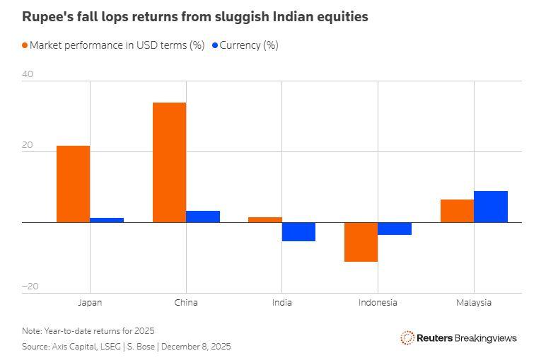Οι εμπορικές τριβές της Ινδίας με την Ουάσιγκτον έχουν αντίκτυπο στη ρουπία. Η απότομη πτώση της κατά 3% έναντι του δολαρίου ΗΠΑ από τα τέλη Οκτωβρίου, όταν οι Ηνωμένες Πολιτείες επέβαλαν νέες κυρώσεις σε δύο ρωσικούς παραγωγούς πετρελαίου, ισούται με την συνολική απώλεια αξίας του νομίσματος το 2024. Συνολικά, έχει υποχωρήσει περισσότερο από 5% έναντι του δολαρίου φέτος, κατατάσσοντας την ρουπία ως το νόμισμα με την χειρότερη απόδοση στην Ασία. Πρόκειται για μια σοβαρή πραγματικότητα για το Νέο Δελχί.