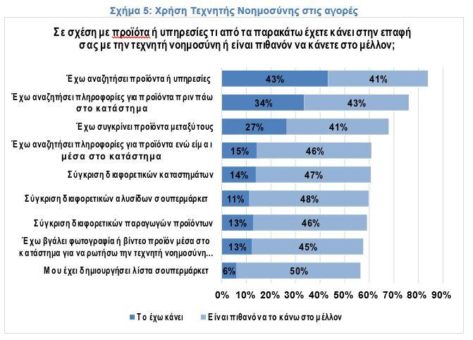 Συγκεκριμένα σε σχέση με τις αγορές, όπως αναφέρθηκε νωρίτερα, παρότι η χρήση της ΤΝ για αγορές βρίσκεται ακόμη σε σχετικά πρώιμο στάδιο, ήδη σημαντικό μέρος των καταναλωτών την αξιοποιεί για έρευνα προϊόντων, συγκρίσεις και πληροφόρηση πριν ή κατά τη διάρκεια της επίσκεψης στο κατάστημα. Ακόμη πιο κρίσιμο είναι ότι σχεδόν οι μισοί καταναλωτές δηλώνουν πρόθεση να χρησιμοποιήσουν αυτές τις λειτουργίες στο μέλλον, δείχνοντας ότι η ΑΙ μπορεί να μετατραπεί πιθανόν σύντομα σε βασικό εργαλείο προετοιμασίας και υποστήριξης του αγοραστικού ταξιδιού. Σύμφωνα με τα στοιχεία (σχήμα 5) στον πληθυσμό των χρηστών ΤΝ: