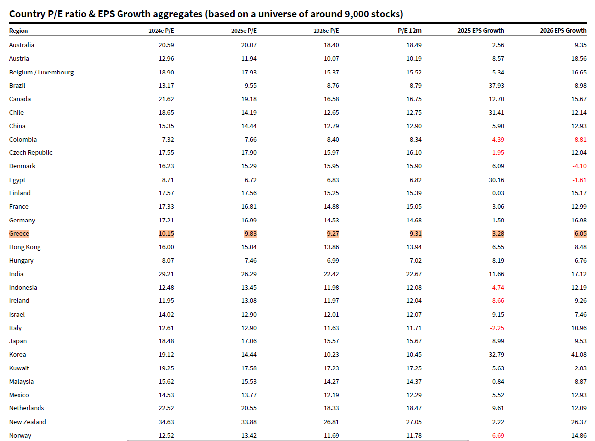 Ειδικότερα, αναλύοντας τους δείκτες P/E διαφόρων χωρών (βάσει ενός συμπλέγματος 9.000 μετοχών), η Societe Generale τοποθετεί τον δείκτη για την Ελλάδα στο 9,83x το 2025 και στο 9,27x το 2026. Ουσιαστικά είναι ένας από τους έξι μονοψήφιους δείκτες, την ώρα που οι αντίστοιχοι σε 42 χώρες είναι σε διψήφια επίπεδα.