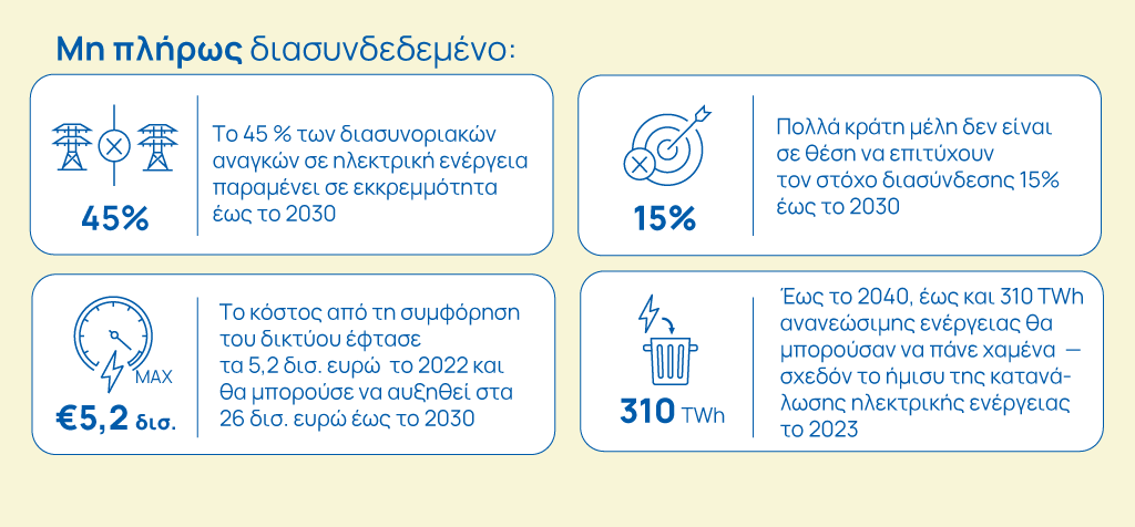 Παρά την πρόοδο που έχει επιτευχθεί στο πλαίσιο του ισχύοντος νομικού πλαισίου της ΕΕ, η ΕΕ δεν έχει επιτύχει το επίπεδο διασυνδεσιμότητας μεταξύ των κρατών μελών που θα επέτρεπε τη δημιουργία μιας πραγματικής Ενεργειακής Ένωσης, καθώς πολλά κράτη μέλη δεν είναι σε θέση να επιτύχουν τον στόχο διασυνδεσιμότητας 15% έως το 2030.