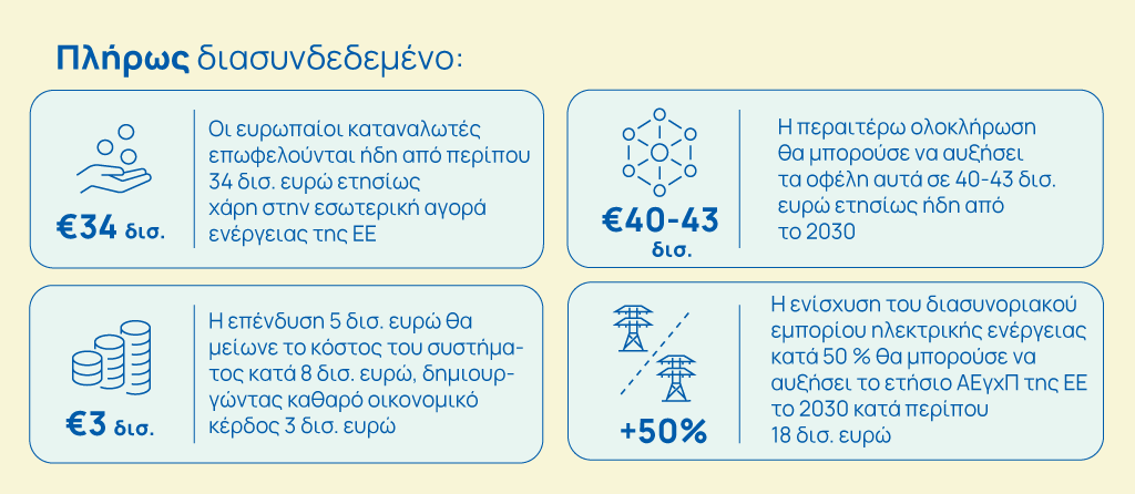 Η ενισχυμένη ολοκλήρωση της αγοράς θα μπορούσε να οδηγήσει σε ετήσια εξοικονόμηση κόστους 40 δισεκατομμυρίων ευρώ, ενώ η αύξηση του διασυνοριακού εμπορίου ηλεκτρικής ενέργειας κατά 50% θα μπορούσε να αυξήσει την ετήσια αύξηση του ΑΕγχΠ της ΕΕ κατά περίπου 18 δισεκατομμύρια ευρώ έως το 2030.