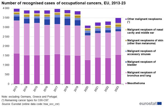 Οι πιο συνηθισμένοι τύποι επαγγελματικών καρκίνων στην ΕΕ ήταν το μεσοθηλίωμα και ο καρκίνος του πνεύμονα και των βρόγχων, με 1 553 και 1 226 περιπτώσεις, αντίστοιχα, το 2023.