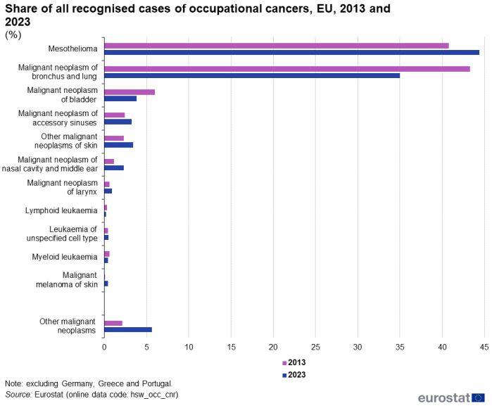 Το 2023, ο αριθμός των αναγνωρισμένων περιπτώσεων μεσοθηλιώματος ως επαγγελματικού καρκίνου ήταν 1.553, ενώ ο αριθμός των περιπτώσεων καρκίνου του πνεύμονα και των βρόγχων ήταν 1.226. Μαζί, αυτοί οι δύο τύποι καρκίνου αντιπροσώπευαν περίπου τα τέσσερα πέμπτα (79,4 %) όλων των αναγνωρισμένων περιπτώσεων επαγγελματικών καρκίνων, όπως φαίνεται στο ακόλουθο διάγραμμα.