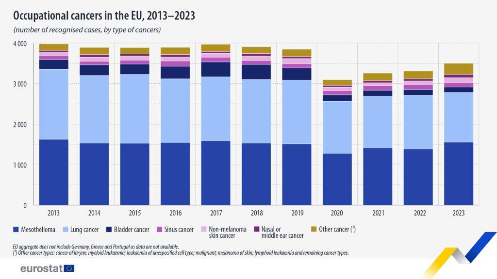 Μεταξύ 2013 και 2023, 40.538 περιπτώσεις καρκίνου που σχετίζονται με την εργασία αναγνωρίστηκαν επίσημα στην ΕΕ. Το 2023, αναγνωρίστηκαν 3.500 περιπτώσεις καρκίνου που σχετίζονται με την εργασία, 191 περισσότερες από ό,τι το 2022 (3.309).