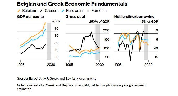 Εν τω μεταξύ, το Βέλγιο, όπου εδρεύουν οι μεγαλύτεροι ευρωπαϊκοί θεσμοί και το ΝΑΤΟ, δίνει μάχη για να περιορίσει τα ελλείμματα που υπερβαίνουν κατά πολύ το ανώτατο όριο της ΕΕ. Το χρέος του Βελγίου βρίσκεται σε τροχιά να ξεπεράσει το χρέος της Ελλάδας μέχρι το 2030.