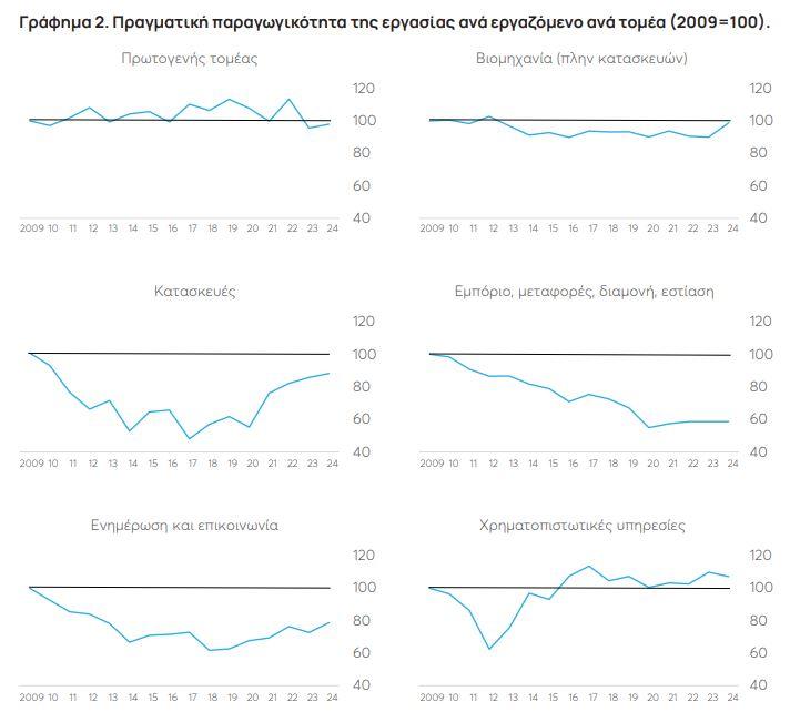 Το 2024, η παραγωγικότητα ανά ώρα εργασίας βρίσκεται περίπου 14% χαμηλότερα, ενώ η παραγωγικότητα ανά εργαζόμενο παραμένει ακόμη πιο πίσω, περίπου 18% κάτω από τα επίπεδα του 2009. Η Ελλάδα αποτελεί την εξαίρεση στην ομάδα των χωρών της κρίσης, καθώς κανένας από τους βασικούς δείκτες παραγωγικότητας δεν έχει επανέλθει στα επίπεδα του 2009.