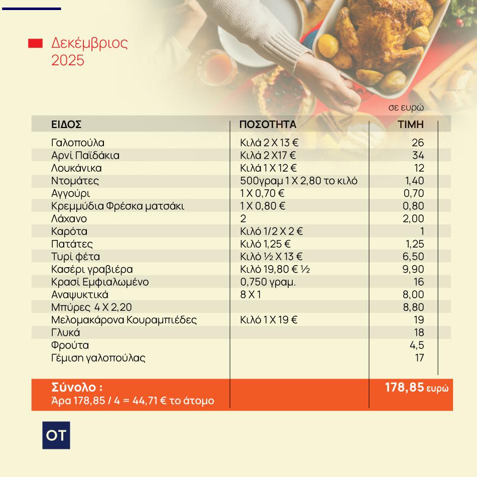 Έτσι, το τραπέζι 4 ατόμων για την ημέρα των Χριστουγέννων κοστίζει φέτος 178,85 ευρώ, που αντιστοιχεί σε κόστος 44,71 ευρώ ανά άτομο. Πέρσι τα Χριστούγεννα ήταν 156,02 με τα ίδια είδη.