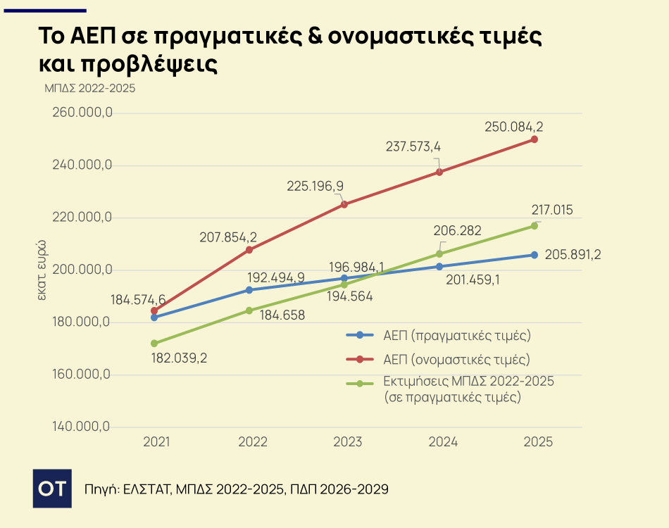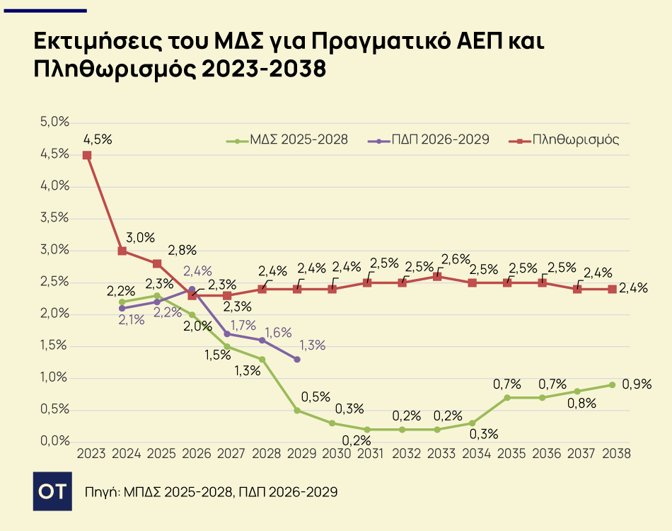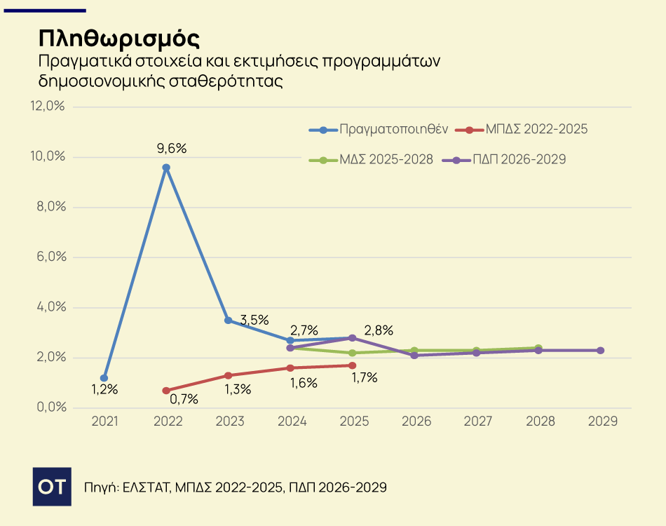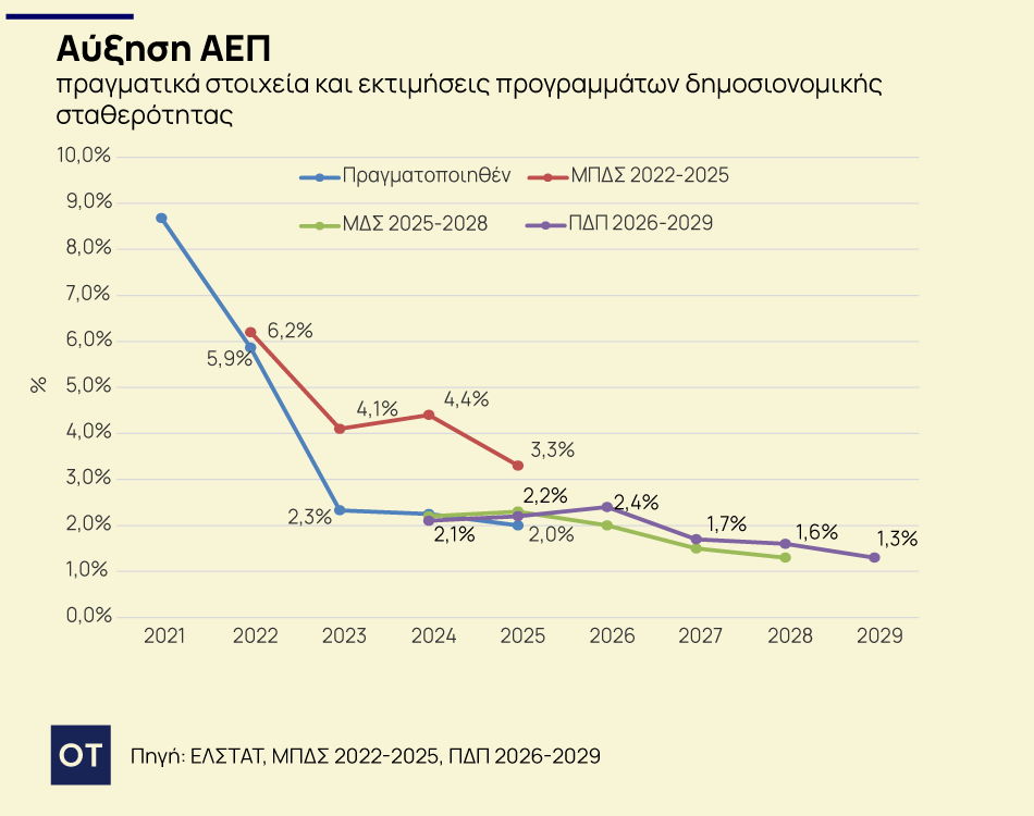 Από τα στοιχεία και τις εκτιμήσεις του Πολυετούς Δημοσιονομικού Προγραμματισμού διαπιστώνεται η συνεχής μείωση του ρυθμού ανάπτυξης της ελληνικής οικονομίας και η διατήρηση ενός επίμονου πληθωρισμού που θα διαβρώνει την αγοραστική δύναμη εργαζομένων και συνταξιούχων. Ειδικότερα, στο Διάγραμμα 1 παρατηρούμε την σύγκριση των πραγματοποιηθέντων στοιχείων με αυτά που προβλέπονταν στο Μεσοπρόθεσμο Πρόγραμμα Δημοσιονομικής Στρατηγικής 2022-2025 που είχε εκπονηθεί το 2021 και του Μεσοπρόθεσμου-Διαρθρωτικού Σχεδίου 2025-2028 και του νέου Πολυετούς Δημοσιονομικού Προγράμματος για την τετραετία 2026-2029.