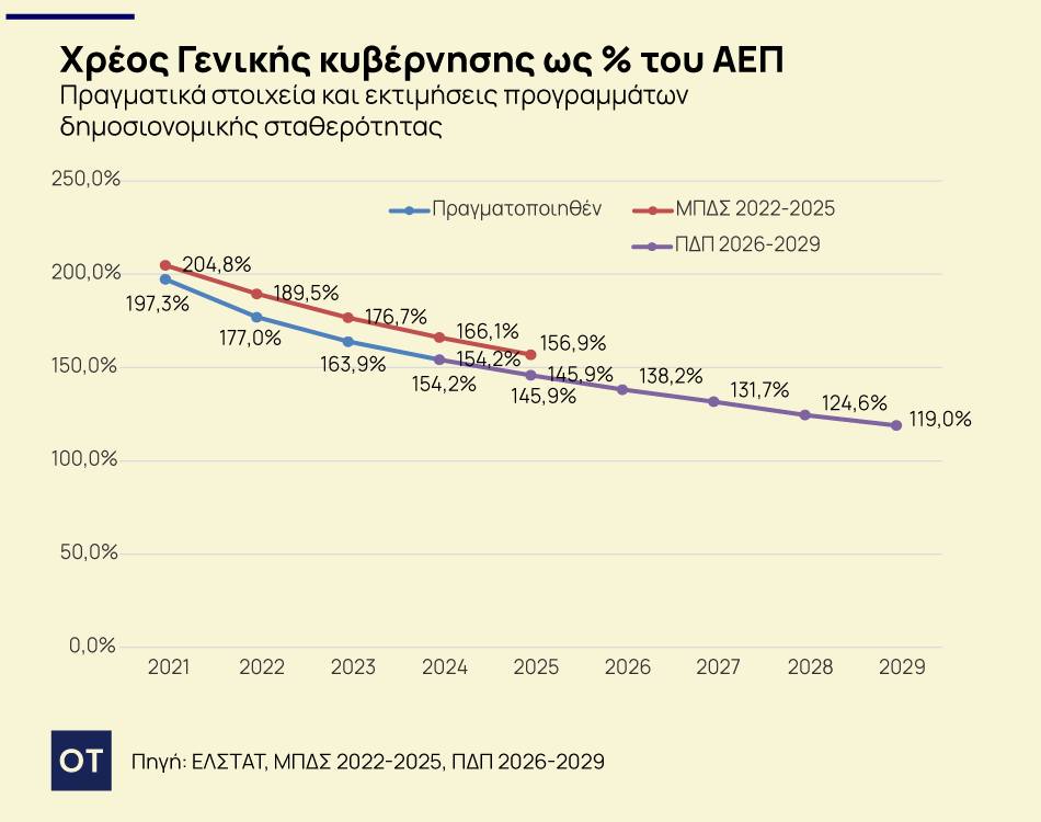 Πράγματι, στο ΜΠΔΣ 2022-2025, προβλέπονταν ότι το χρέος θα μειώνονταν από το 204,8% του ΑΕΠ το 2021, στο 156,9% το 2025. Τελικά, όμως το 2025 μειώθηκε στο 145,9% και αυτό οφείλεται στο ότι ο πληθωρισμός ενώ προβλέπονταν την περίοδο 2022 – 2025 να κυμαίνεται στο 1,5% τελικά ήταν τριπλάσιος, στο 4,7% κατά μέσο όρο ετησίως.