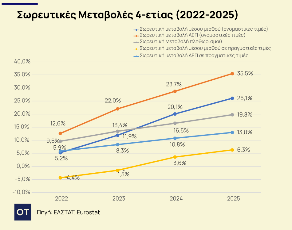 Το γεγονός αυτό διαπιστώνεται και από την πορεία του χρέους (γενικής κυβέρνησης) σε χρηματικές μονάδες (ευρώ) αφού στο ΜΠΔΣ 2022 – 2025 προβλέπονταν ότι θα μειώνονταν από τα 352,5 δις ευρώ το 2021 στα 340,4 δις ευρώ το 2025, αλλά τελικά, σύμφωνα με τα στοιχεία του ΟΔΔΗΧ, το χρέος στις 30/9/2025 αντί να μειωθεί, αντιθέτως, αυξήθηκε στα 368 δις ευρώ. Επιπλέον στην τετραετία 2022-2025 το μέσο επίπεδο των μισθών αυξήθηκε σωρευτικά κατά 26,1% υπερκαλύπτοντας την αντίστοιχη σωρευτική αύξηση του πληθωρισμού που την ίδια περίοδο ήταν 19,8%. Όμως, στο ίδιο χρονικό διάστημα η σωρευτική ονομαστική αύξηση του ΑΕΠ ήταν 35,5% και η πραγματική 13%. Έτσι, όπως βλέπουμε στο Διάγραμμα 5, το μέσο επίπεδο του μισθού σε πραγματικές τιμές αυξήθηκε σωρευτικά κατά 6,3%. Δηλαδή, διαπιστώνουμε ότι οι μισθοί στην Ελλάδα την 4-ετία 2022-2025 αυξήθηκαν στο 48% της αύξησης του πραγματικού ΑΕΠ.