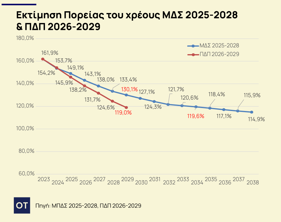 Ειδικότερα, το ΜΔΣ 2025-2028 είναι αυτό που κατατίθεται στην Ευρωπαϊκή Επιτροπή και στο Συμβούλιο της Ευρωπαϊκής Ένωσης, ενώ το ΠΔΠ καλύπτει την περίοδο 2026-2029 και παρουσιάζει τις δημοσιονομικές εκτιμήσεις και τις δεσμεύσεις οι οποίες είναι συνεπείς με τα όρια που προβλέπονται στο ΜΔΣ 2025-2028, όπως χαρακτηριστικά αναφέρεται σ΄αυτό. Πιο συγκεκριμένα, ενώ στο ίδιο το ΠΔΠ γίνεται αναφορά για συνεπείς δημοσιονομικές εκτιμήσεις με το ΜΔΣ που κατατέθηκε στην Ευρωπαϊκή Επιτροπή, στο ΠΔΠ το χρέος παρουσιάζεται να μειώνεται στο 119% του ΑΕΠ το 2029 ενώ στο ΜΔΣ το χρέος εκτιμάται στο 130% του ΑΕΠ το 2029 ενώ η μείωση στο επίπεδο του 119% του ΑΕΠ εκτιμάται το 2034 και 115% του ΑΕΠ το 2038 (Διάγραμμα 6).