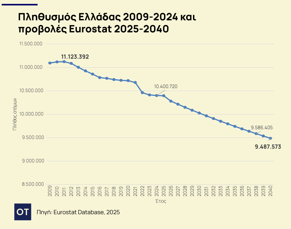 Κατά συνέπεια, με βάση τις προβλέψεις μέχρι το 2038 του ΜΔΣ για τον ρυθμό ανάπτυξης και τον πληθωρισμό (Διάγραμμα 7) και με βάση τον μαθηματικό τύπο αύξησης των συντάξεων κατά το 50% της ανάπτυξης και 50% του πληθωρισμού τότε θα απαιτηθούν τα διπλάσια χρόνια από τους μισθούς, δηλαδή το 2060, προκειμένου να επιτευχθεί το επίπεδο αγοραστικής δύναμης των συντάξεων του 2009. Σε αυτό το δυσοίωνο δημοσιονομικό περιβάλλον, της περιόδου 2027-2038 όπως προβλέπεται στο ΜΔΣ 2025-2028, θα πρέπει να λάβουμε υπόψη και τις δυσοίωνες δημογραφικές προοπτικές της χώρας μας. Στην 16-ετη περίοδο 2009-2024, ο πληθυσμός της Ελλάδας μειώθηκε κατά 694.025 άτομα (6,25%). Κατά 353.580 άτομα ήταν η μείωση την 10-ετία 2009-2018 και κατά 340.445 ήταν την εξαετία 2019-2024. Δηλαδή, η μείωση του πληθυσμού την τελευταία εξαετία ήταν όση ήταν την δεκαετή περίοδο των μνημονίων 2009-2018. Στις συνθήκες αυτές, σύμφωνα με τις δημογραφικές προβολές της Eurostat, ο πληθυσμός της Ελλάδας θα μειωθεί περαιτέρω στους 9.487.573 άτομα μέχρι το 2040 (Διάγραμμα 8).