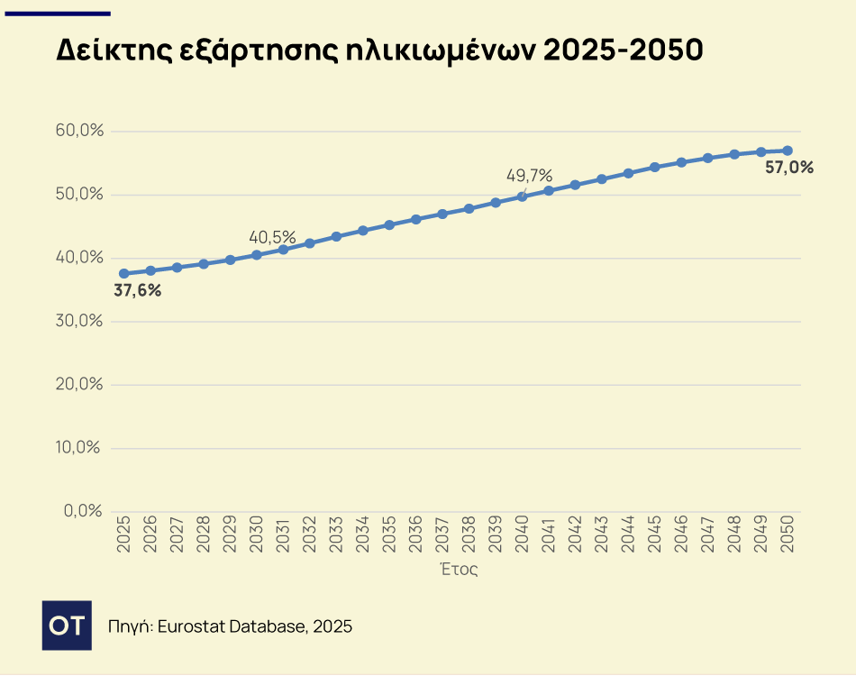 Επιπλέον, της μείωσης του πληθυσμού η χώρα μας κατά τα επόμενα έτη θα βρεθεί αντιμέτωπη και με τις αρνητικές επιπτώσεις της γήρανσης του πληθυσμού αφού ο δείκτης γήρανσης θα αυξηθεί από 37,6% το 2025, σε 40,5% το 2030, σε 49,7% το 2040 και σε 57% μέχρι το 2050 (Διάγραμμα 9), δυσκολεύοντας έτσι ακόμα περισσότερο την επίτευξη υψηλότερων ρυθμών ανάπτυξης, δεδομένου ότι η γήρανση του πληθυσμού επιδρά αρνητικά στο επίπεδο της παραγωγικότητας και της οικονομικής ανάπτυξης (1% ετησίως μέχρι το 2060).