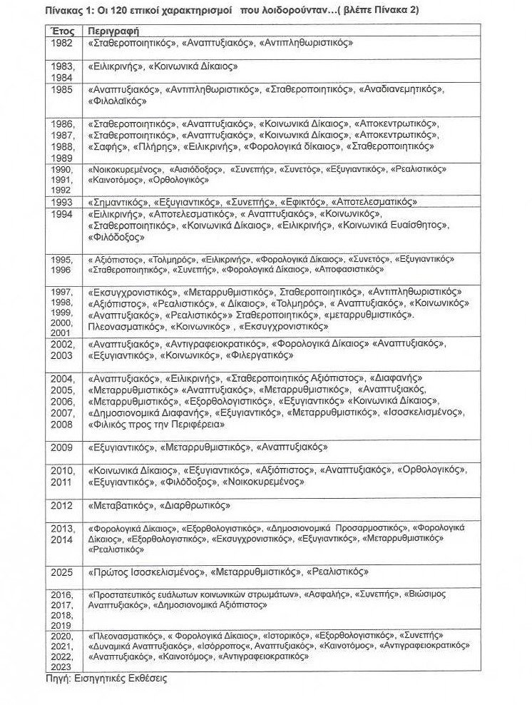 Από τον φάκελο προκύπτει ότι η κατάθεση στη Βουλή των 50 κρατικών προϋπολογισμών συνοδευόταν από απίστευτους σε έμπνευση επικούς χαρακτηρισμούς (βλέπε πίνακα), με προβλέψεις που ποτέ δεν επαληθεύονταν και με προγράμματα, τα οποία, αντί σταθεροποίησης και εξυγίανσης της οικονομίας, είχαν το αντίθετο εφιαλτικό αποτέλεσμα (έλλειμμα και, κυρίως, συνεχείς αυξήσεις του χρέους, οι οποίες κάθε σχεδόν χρόνο καταρριπτόταν το προηγούμενο αρνητικό ρεκόρ. Είναι απογοητευτική η διαπίστωση ότι το χρέος από 2,4 δις. ευρώ το 1981 εκτινάχθηκε το 2024 στο (πραγματικό) άνω των 400 δις. ευρώ με συνεχείς (ούτε μία μείωση!) αυξήσεις σε απόλυτους αριθμούς.
