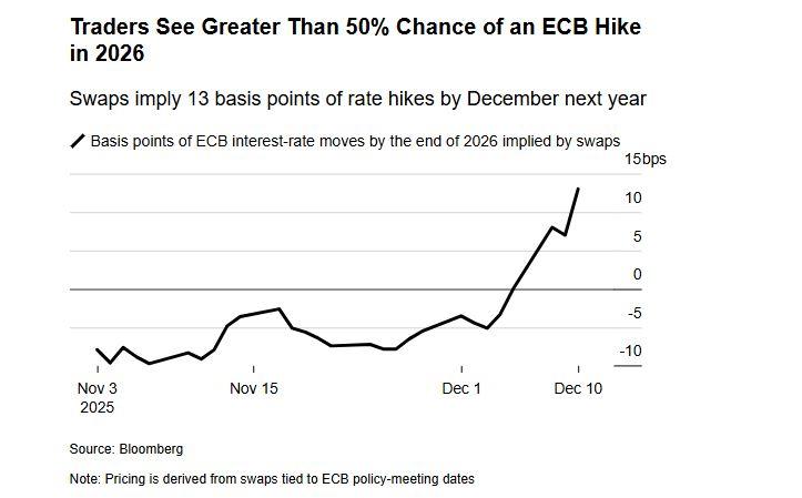 Οι επενδυτές στοιχηματίζουν τώρα σε πιθανότητα άνω του 50% ότι η Ευρωπαϊκή Κεντρική Τράπεζα θα αυξήσει τα επιτόκια το 2026, επηρεασμένοι από τις επιθετικές δηλώσεις της Ιζαμπέλ Σνάιντερ, μέλους του διοικητικού συμβουλίου της ΕΚΤ, γνωστής για τη «γερακίσια» στάση της.