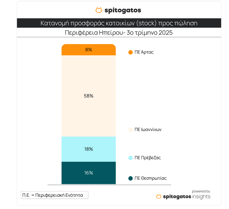 Άνω του 50% του διαθέσιμου stock κατοικιών προς πώληση εντοπίζεται στην Π.Ε. Ιωαννίνων, ενώ το 18% εντοπίζεται στην Π.Ε. Πρέβεζας και ακολουθεί η Π.Ε. Θεσπρωτίας με 16%. Το μικρότερο ποσοστό σημειώνεται στην Π.Ε. Άρτας (8%).