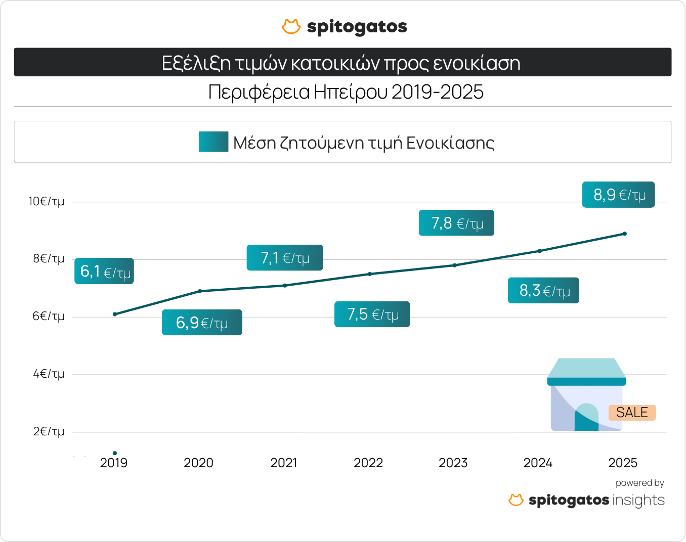 Από το 2019 έως σήμερα, η Μέση Ζητούμενη Τιμή (ΜΖΤ) των κατοικιών προς ενοικίαση στην Περιφέρεια Ηπείρου εμφανίζει σταθερά αυξητική πορεία, με τη συνολική αύξηση να φτάνει το 47,2%.